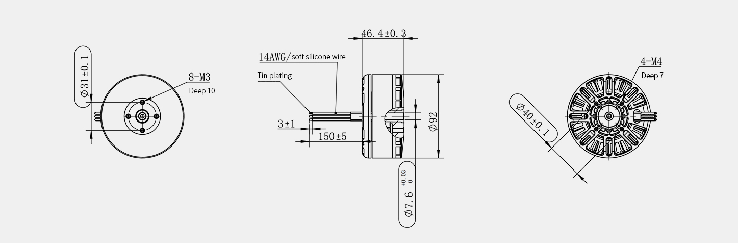 ● In terms of core performance, the motor has a maximum power output of 2900-3000W, a maximum efficiency of approximately 89%, a no-load current of 1.7A/30V, and a maximum thrust ranging from 6-17.5kg (varies by brand and model). The rated load is 5-10kg per motor, which can support a maximum takeoff weight of about 33kg for a quadcopter. It features high-purity oxygen-free copper manual winding and 180℃ heat-resistant enameled wire, paired with high-quality bearings such as EZO, providing excellent heat dissipation and durability.